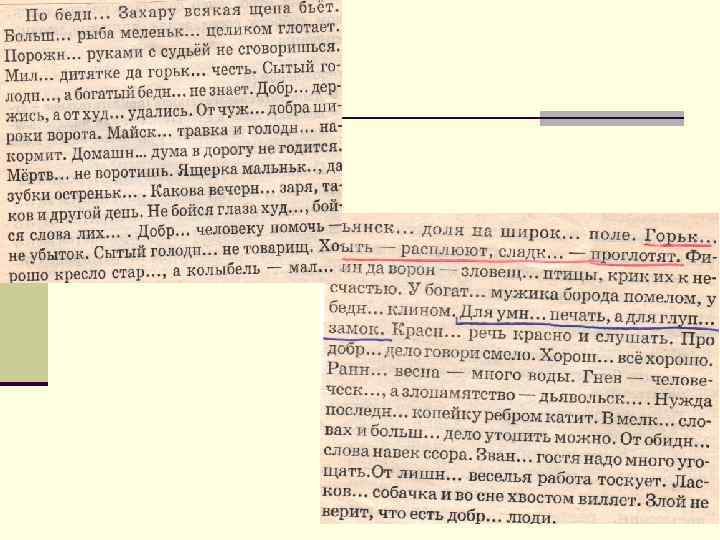 Примеры выполненных заданий «Ой, бабай, Ты собаченька не лай И гудочек не гуди, Нашу Лизу не буди» «Валюха – горюха, сидела без уха, шишки ела, нам велела!» «Сопли, рвота, кровь и пот – Получается компот. Слово скажешь – выпьешь чашку, Рассмеёшься – съешь какашку!»