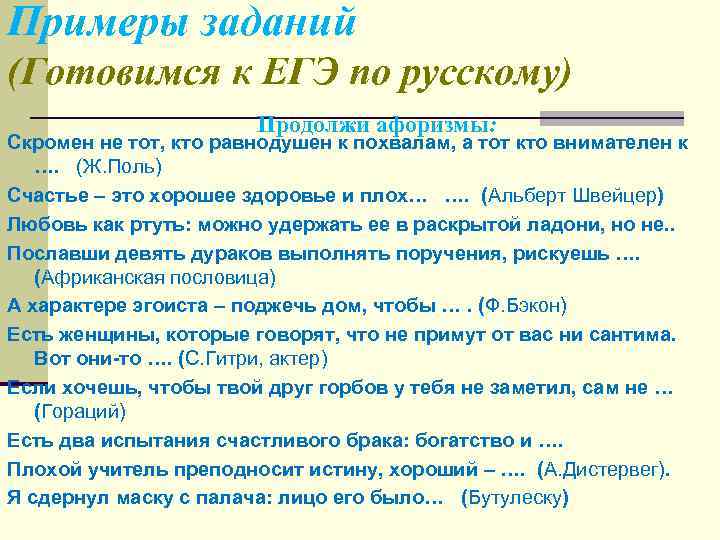 Примеры заданий (Готовимся к ЕГЭ по русскому) Продолжи афоризмы: Скромен не тот, кто равнодушен к похвалам, а тот кто внимателен к …. (Ж. Поль) Счастье – это хорошее здоровье и плох… …. (Альберт Швейцер) Любовь как ртуть: можно удержать ее в раскрытой ладони, но не. . Пославши девять дураков выполнять поручения, рискуешь …. (Африканская пословица) А характере эгоиста – поджечь дом, чтобы …. (Ф. Бэкон) Есть женщины, которые говорят, что не примут от вас ни сантима. Вот они-то …. (С. Гитри, актер) Если хочешь, чтобы твой друг горбов у тебя не заметил, сам не … (Гораций) Есть два испытания счастливого брака: богатство и …. Плохой учитель преподносит истину, хороший – …. (А. Дистервег). Я сдернул маску с палача: лицо его было… (Бутулеску)