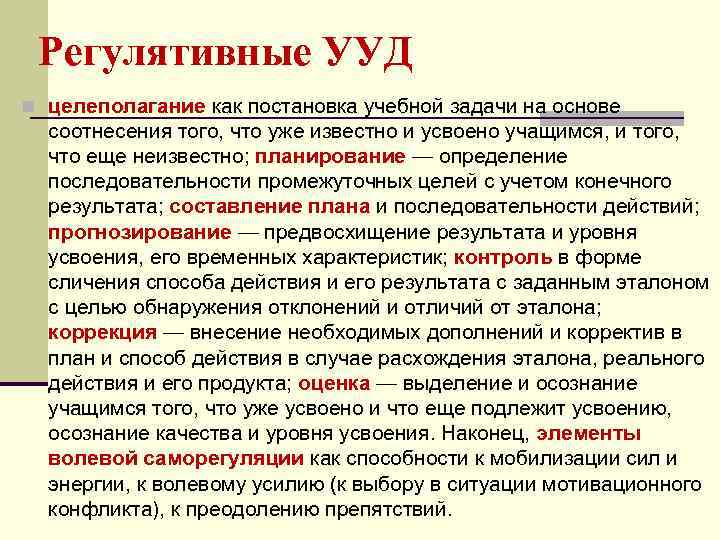 Регулятивные УУД n целеполагание как постановка учебной задачи на основе соотнесения того, что уже известно и усвоено учащимся, и того, что еще неизвестно; планирование — определение последовательности промежуточных целей с учетом конечного результата; составление плана и последовательности действий; прогнозирование — предвосхищение результата и уровня усвоения, его временных характеристик; контроль в форме сличения способа действия и его результата с заданным эталоном с целью обнаружения отклонений и отличий от эталона; коррекция — внесение необходимых дополнений и корректив в план и способ действия в случае расхождения эталона, реального действия и его продукта; оценка — выделение и осознание учащимся того, что уже усвоено и что еще подлежит усвоению, осознание качества и уровня усвоения. Наконец, элементы волевой саморегуляции как способности к мобилизации сил и энергии, к волевому усилию (к выбору в ситуации мотивационного конфликта), к преодолению препятствий.