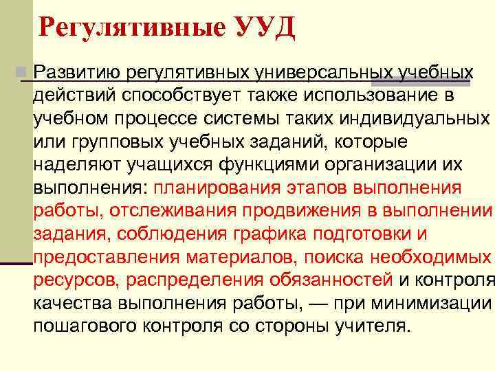 Регулятивные УУД n Развитию регулятивных универсальных учебных действий способствует также использование в учебном процессе системы таких индивидуальных или групповых учебных заданий, которые наделяют учащихся функциями организации их выполнения: планирования этапов выполнения работы, отслеживания продвижения в выполнении задания, соблюдения графика подготовки и предоставления материалов, поиска необходимых ресурсов, распределения обязанностей и контроля качества выполнения работы, — при минимизации пошагового контроля со стороны учителя.