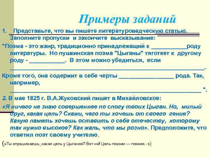 Примеры заданий 1. Представьте, что вы пишете литературоведческую статью. Заполните пропуски и закончите высказывание: "Поэма - это жанр, традиционно принадлежащий к ______роду литературы. Но пушкинская поэма "Цыганы" тяготеет к другому роду - ______. В этом можно убедиться, если ______________________________. Кроме того, она содержит в себе черты _________ рода. Так, например, ______________________________ ". 2. В мае 1825 г. В. А. Жуковский пишет в Михайловское: «Я ничего не знаю совершеннее по слогу твоих Цыган. Но, милый друг, какая цель? Скажи, чего ты хочешь от своего гения? Какую память хочешь оставить о себе отечеству, которому так нужно высокое? Как жаль, что мы розно» . Предположите, что ответил поэт своему учителю. ( «Ты спрашиваешь, какая цель у Цыганов? Вот на! Цель поэзии — поэзия. . . » )