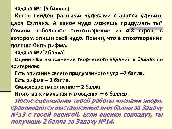 Задача № 1 (6 баллов) Князь Гвидон разными чудесами старался удивить царя Салтана. А какое чудо можешь придумать ты? Сочини небольшое стихотворение из 4 -8 строк, в котором опиши своё чудо. Помни, что в стихотворении должна быть рифма. Задача № 2(2 балла) Оцени сам выполнение творческого задания в баллах по критериям: Есть описание своего придуманного чуда – 2 балла. Есть рифма – 2 балла. Смысловое наполнение – 2 балла. Итого максимальная самооценка – 6 баллов. После оценивания твоей работы членами жюри, сравниваются выставленные ими баллы за Задачу № 13 с твоей оценкой. Если оценки совпадут, ты получишь 2 балла за Задачу № 14.