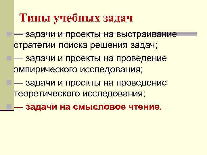 Типы учебных задач n — задачи и проекты на выстраивание стратегии поиска решения задач; n — задачи и проекты на проведение эмпирического исследования; n — задачи и проекты на проведение теоретического исследования; n — задачи на смысловое чтение.