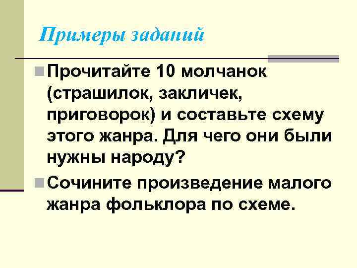 Примеры заданий n Прочитайте 10 молчанок (страшилок, закличек, приговорок) и составьте схему этого жанра. Для чего они были нужны народу? n Сочините произведение малого жанра фольклора по схеме.