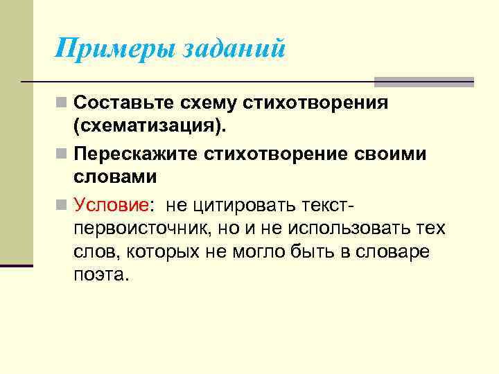 Примеры заданий n Составьте схему стихотворения (схематизация). n Перескажите стихотворение своими словами n Условие: не цитировать текст первоисточник, но и не использовать тех слов, которых не могло быть в словаре поэта.