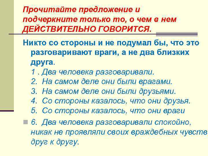 Прочитайте предложение и подчеркните только то, о чем в нем ДЕЙСТВИТЕЛЬНО ГОВОРИТСЯ. Никто со стороны и не подумал бы, что это разговаривают враги, а не два близких друга. 1. Два человека разговаривали. 2. На самом деле они были врагами. 3. На самом деле они были друзьями. 4. Со стороны казалось, что они друзья. 5. Со стороны казалось, что они враги n 6. Два человека разговаривали спокойно, никак не проявляли своих враждебных чувств друг к другу.