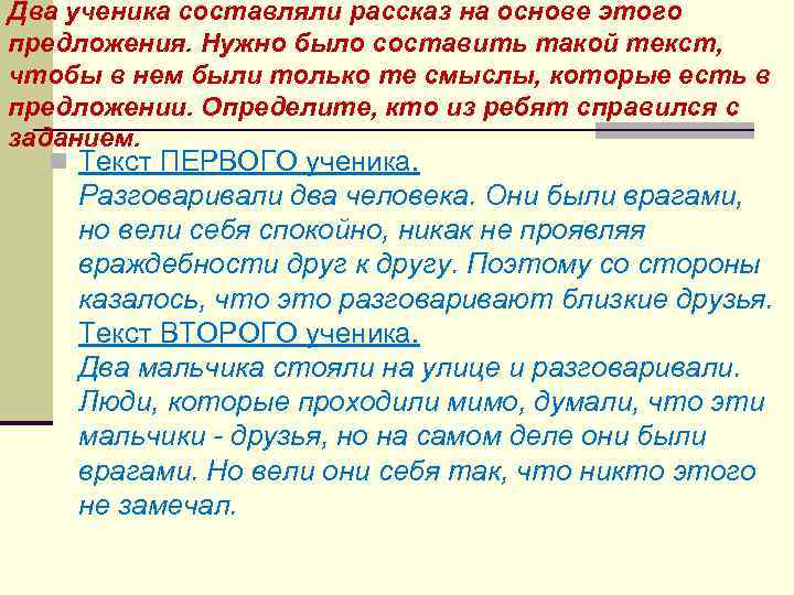 Два ученика составляли рассказ на основе этого предложения. Нужно было составить такой текст, чтобы в нем были только те смыслы, которые есть в предложении. Определите, кто из ребят справился с заданием. n Текст ПЕРВОГО ученика. Разговаривали два человека. Они были врагами, но вели себя спокойно, никак не проявляя враждебности друг к другу. Поэтому со стороны казалось, что это разговаривают близкие друзья. Текст ВТОРОГО ученика. Два мальчика стояли на улице и разговаривали. Люди, которые проходили мимо, думали, что эти мальчики - друзья, но на самом деле они были врагами. Но вели они себя так, что никто этого не замечал.