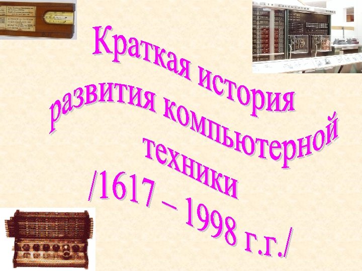 Немного из истории 1617 г. – создана логарифмическая линейка 1623 г. – первая «считающая машина» , созданная Уильямом Шикардом. Выполняла сложение и вычитание с 7 – значными числами.