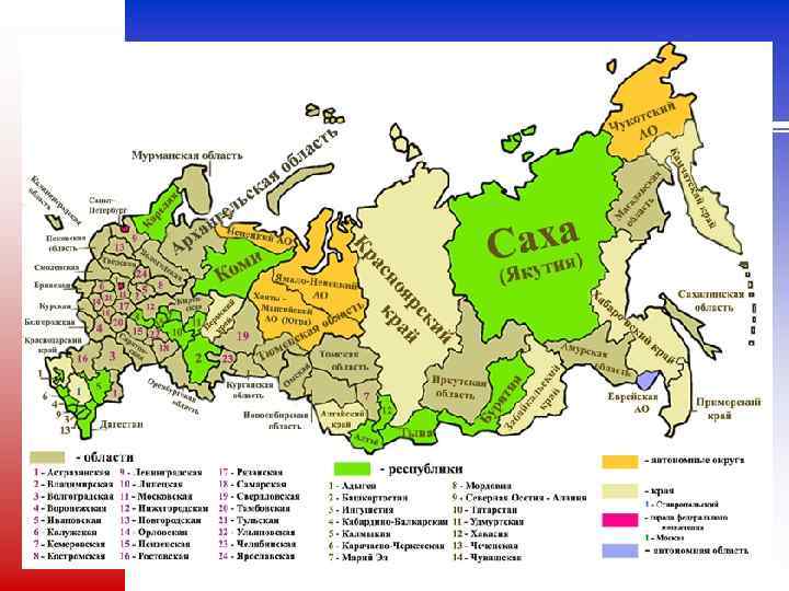 Субъекты Российской Федерации n Словосочетание «субъект Российской Федерации» означает «равный член, полноправный участник» n В составе Российской Федерации 83 равноправных субъекта федерации, в том числе 21 республика, 9 краёв, 46 областей, 2 города федерального значения, 1 автономная область, 4 автономных округа.