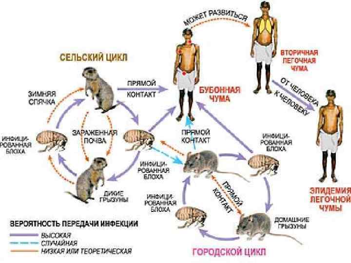 Эпидемиология Возбудитель чумы устойчив к низким температурам, хорошо сохраняется в мокроте, но при температуре 55 °C погибает в течение 10— 15 мин, а при кипячении — практически немедленно. Попадает в организм через кожу (при укусе блохи, как правило, Xenopsylla cheopis), слизистые оболочки дыхательных путей, пищеварительного тракта, конъюнктивы. По основному носителю природные очаги чумы подразделяют на сусликовые, сурочьи, песчаночьи, полевочьи и пищуховые. Помимо диких грызунов, в эпизоотический процесс иногда включаются так называемые синантропные грызуны (в частности, крысы и мышевидные), а также некоторые дикие животные (зайцы, лисы), являющиеся объектом охоты. Из домашних животных чумой болеют верблюды.
