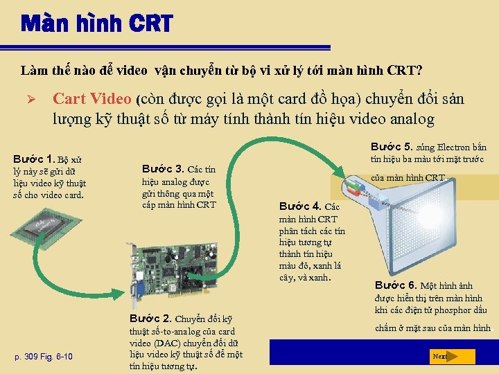 Màn hình CRT Làm thế nào để video vận chuyển từ bộ vi xử lý tới màn hình CRT? Ø Cart Video (còn được gọi là một card đồ họa) chuyển đổi sản lượng kỹ thuật số từ máy tính thành tín hiệu video analog Bước 5. súng Electron bắn Bước 1. Bộ xử lý này sẽ gửi dữ liệu video kỹ thuật số cho video card. tín hiệu ba màu tới mặt trước Bước 3. Các tín hiệu analog được gửi thông qua một cáp màn hình CRT của màn hình CRT Bước 4. Các màn hình CRT phân tách các tín hiệu tương tự thành tín hiệu màu đỏ, xanh lá cây, và xanh. Bước 2. Chuyển đổi kỹ p. 309 Fig. 6 -10 thuật số-to-analog của card video (DAC) chuyển đổi dữ liệu video kỹ thuật số để một tín hiệu tương tự. . Bước 6. Một hình ảnh được hiển thị trên màn hình khi các điện tử phosphor dấu chấm ở mặt sau của màn hình Next .