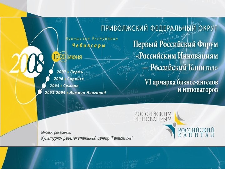 Чувашия – регион сотрудничества ие еск ич акт ные пр но- цион ч Нау аниза тия я орг опри р ме Выставки и ярмарки инновационных идей и проектов Ви з тор иты д опы говые елега том ми ций, сси и, о бм ен I Российский форум «Российским инновациям – российский капитал» , Чувашская Республика, 19 -20 июня 2008 г.