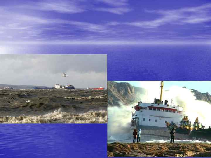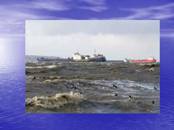 • Природная стихия в ноябре стала причиной экологической катастрофы в Азовском и Черном морях. • В один осенний день из-за сильного шторма затонули четыре судна, еще шесть сели на мель, получили повреждения два танкера, одна баржа находится в дрейфе. • В итоге в воду попало около 6800 тонн серы и около 1300 тонн нефти. • По данным МЧС России, ветер здесь бушевал со скоростью более 32 метров в секунду, а волнение моря составляло 6— 7 баллов.
