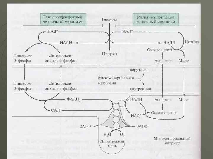 u. У клітинах печінки, серцевого м'яза і інших функціонує так звана малат - аспартатна човникова система перенесення відновлювальних еквівалентів від цитоплазматичного НАДН в мітохондріальний матрикс. Цей механізм відбувається без витрати енергії, оскільки відновлювальні еквівалети цитоплазматичного НАДН в мітохондріях відновлюється також НАДН, окислення якого у дихальному ланцюзi призводить до синтезу трьох молекул АТФ, і сумарний баланс АТФ при повному окисленні однієї молекули глюкози в цьому випадку складе 38 АТФ.