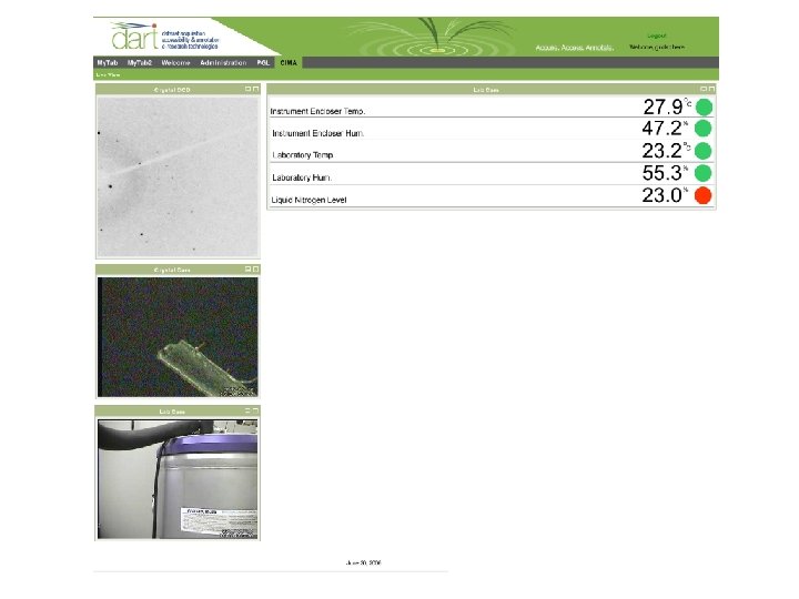 DART - User Portal Use of Personal Grid Library (PGL) for SRB data manipulation / metadata display Metadata schema definitions applied to experimental data - chitter chatter Stored experimental data is able to be easily retrieved, secured annotated Visual diagnostics for sensors (e. g. Graphs, Visual Indicators) Live CCD image analysis (experimental status) ICTP, 23 -28 April 2007
