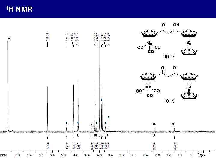 Строение 1 -цимантренил-3 -ферроценил-1, 3 -пропандиона В растворе бензола-d 6 1 H ЯМР 90 % 10 % C(1)-O(1) 1. 291(3) C(1)-C(2) 1. 416(3) C(1)-C(4) 1. 457(3) C(2)-C(3) 1. 382(3) C(3)-O(2) 1. 304(3) C(3)-C(14) 1. 464(3)