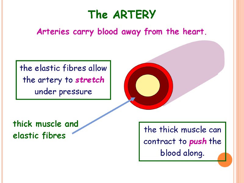 The ARTERY thick muscle and elastic fibres Arteries carry blood away from the heart. the elastic fibres allow the artery to stretch under pressure the thick muscle can contract to push the blood along.