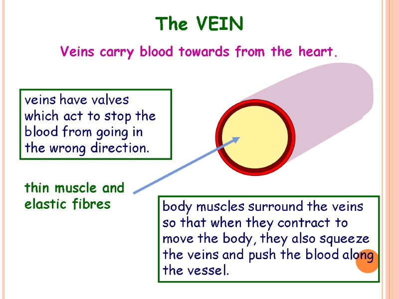 The VEIN Veins carry blood towards from the heart. thin muscle and elastic fibres veins have valves which act to stop the blood from going in the wrong direction. body muscles surround the veins so that when they contract to move the body, they also squeeze the veins and push the blood along the vessel.