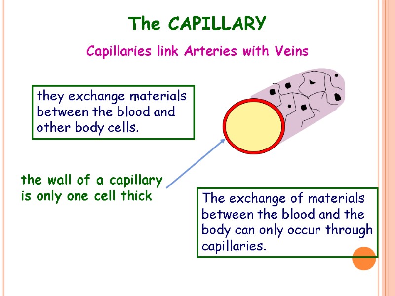 The CAPILLARY Capillaries link Arteries with Veins the wall of a capillary is only one cell thick they exchange materials between the blood and other body cells. The exchange of materials between the blood and the body can only occur through capillaries.