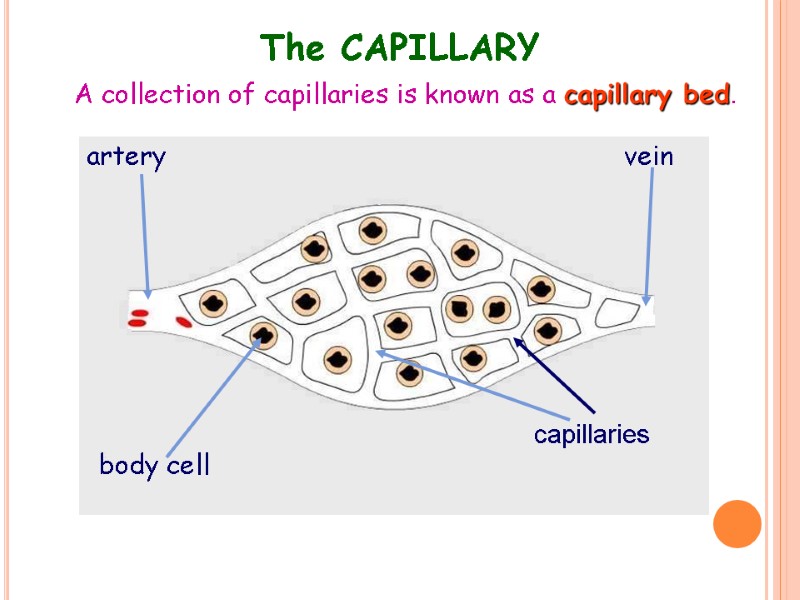artery vein capillaries body cell The CAPILLARY A collection of capillaries is known as a capillary bed.