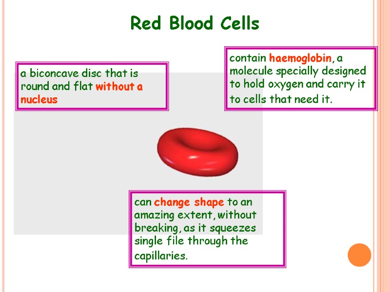 Red Blood Cells contain haemoglobin, a molecule specially designed to hold oxygen and carry it to cells that need it. can change shape to an amazing extent, without breaking, as it squeezes single file through the capillaries. a biconcave disc that is round and flat without a nucleus