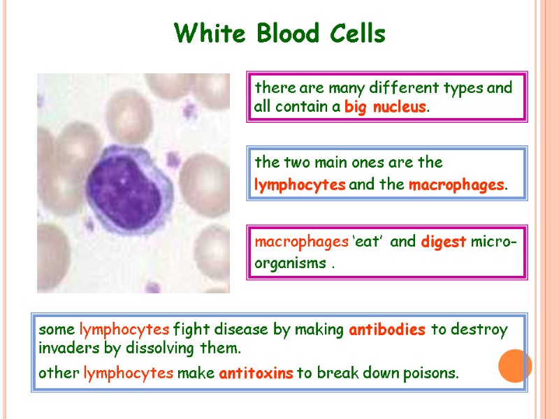 White Blood Cells there are many different types and all contain a big nucleus. the two main ones are the lymphocytes and the macrophages. some lymphocytes fight disease by making antibodies to destroy invaders by dissolving them. other lymphocytes make antitoxins to break down poisons. macrophages ‘eat’ and digest micro-organisms .