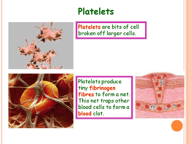 Platelets Platelets are bits of cell broken off larger cells. Platelets produce tiny fibrinogen fibres to form a net. This net traps other blood cells to form a blood clot.