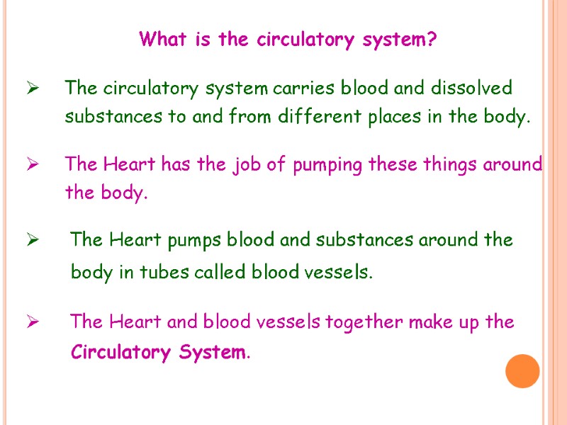 The circulatory system carries blood and dissolved substances to and from different places in the body. The Heart has the job of pumping these things around the body. The Heart pumps blood and substances around the body in tubes called blood vessels. The Heart and blood vessels together make up the Circulatory System. What is the circulatory system?