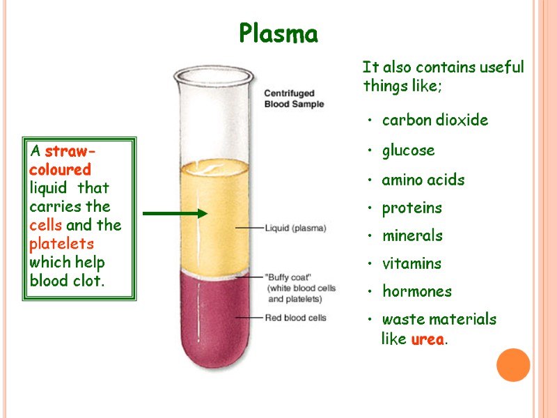 Plasma A straw-coloured liquid that carries the cells and the platelets which help blood clot. carbon dioxide glucose amino acids proteins minerals vitamins hormones waste materials like urea. It also contains useful things like;