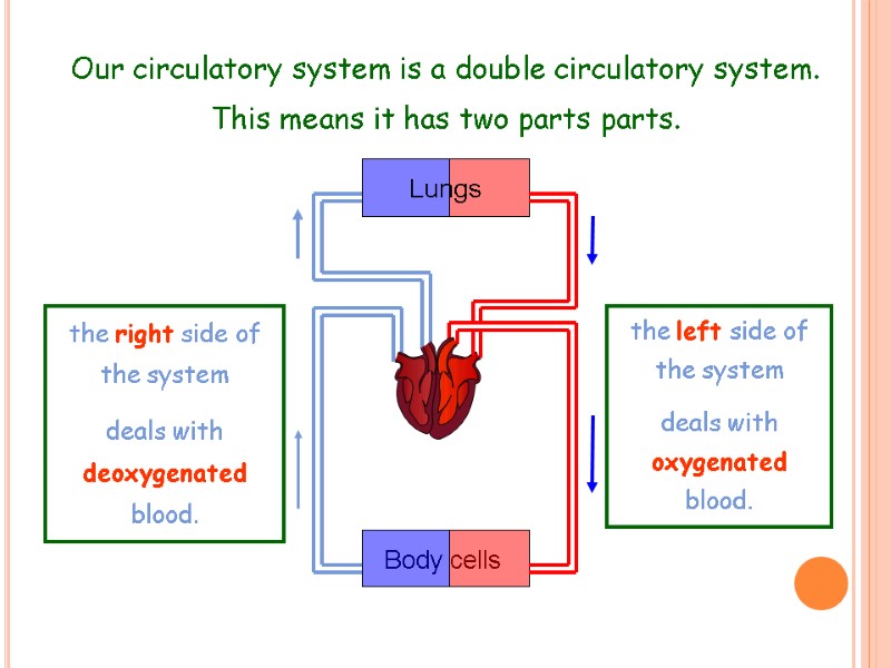 Our circulatory system is a double circulatory system. This means it has two parts parts. the right side of the system deals with deoxygenated blood. the left side of the system deals with oxygenated blood.