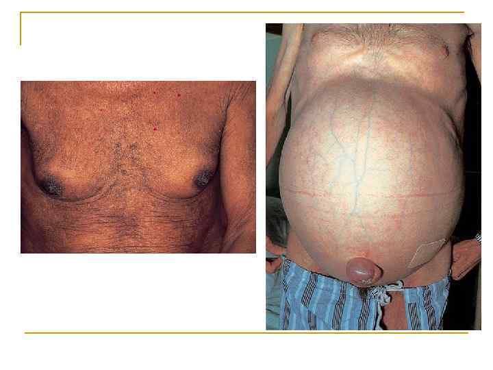 Синдромы ЦП Печеночно-клеточная недостаточность. Геморрагический с-м (носовые кровотечения, кровотечения из десен, кровоизлияния на коже) n Синдром гормонального дисбаланса (сосудистые звездочки, пальмарная эритема, гинекомастия у мужчин, аменорея и гирсутизм у женщин n Синдром гипербилирубинемии (желтуха - желтушное окрашивание склер и кожных покровов, ↑ билирубина за счет неконъюгированной фракции) n