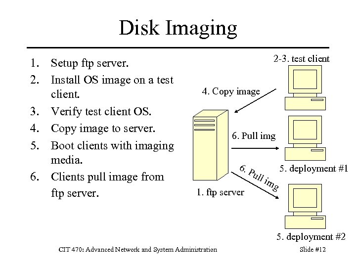 Disk Imaging 1. Setup ftp server. 2. Install OS image on a test client. 3. Verify test client OS. 4. Copy image to server. 5. Boot clients with imaging media. 6. Clients pull image from ftp server. 2 -3. test client 4. Copy image 6. Pull img 6. P ull 1. ftp server 5. deployment #1 im g 5. deployment #2 CIT 470: Advanced Network and System Administration Slide #12