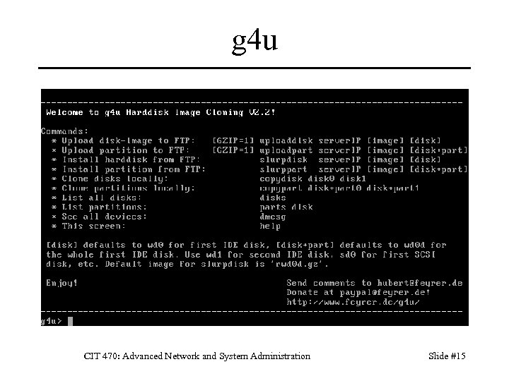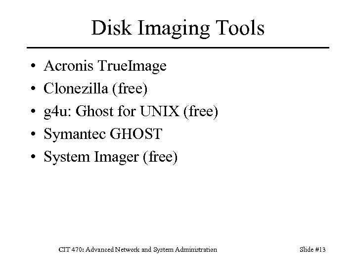 Disk Imaging Tools • • • Acronis True. Image Clonezilla (free) g 4 u: Ghost for UNIX (free) Symantec GHOST System Imager (free) CIT 470: Advanced Network and System Administration Slide #13