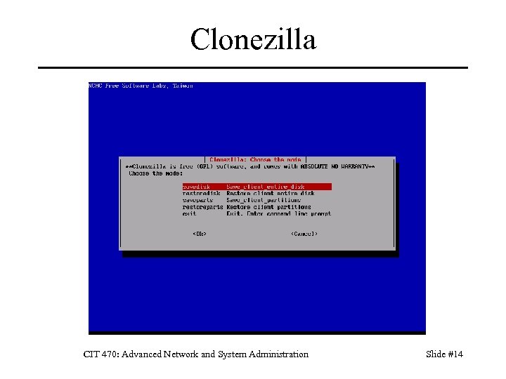 Clonezilla CIT 470: Advanced Network and System Administration Slide #14