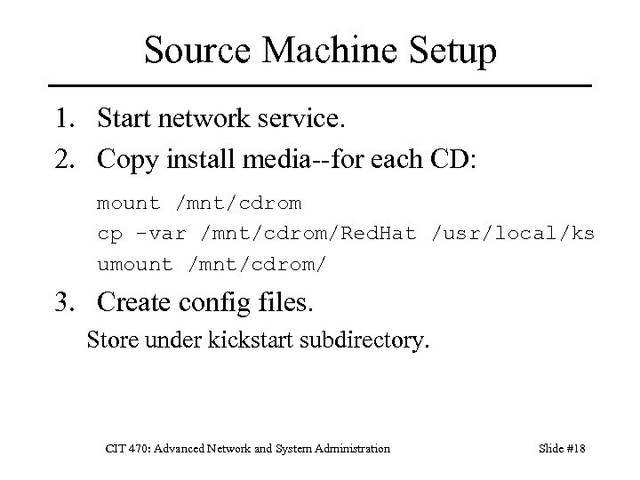 Source Machine Setup 1. Start network service. 2. Copy install media--for each CD: mount /mnt/cdrom cp -var /mnt/cdrom/Red. Hat /usr/local/ks umount /mnt/cdrom/ 3. Create config files. Store under kickstart subdirectory. CIT 470: Advanced Network and System Administration Slide #18