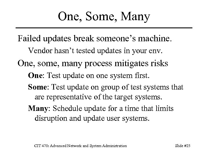 One, Some, Many Failed updates break someone’s machine. Vendor hasn’t tested updates in your env. One, some, many process mitigates risks One: Test update on one system first. Some: Test update on group of test systems that are representative of the target systems. Many: Schedule update for a time that limits disruption and update user systems. CIT 470: Advanced Network and System Administration Slide #25