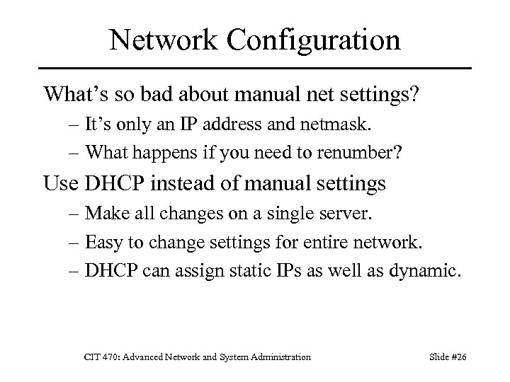 Network Configuration What’s so bad about manual net settings? – It’s only an IP address and netmask. – What happens if you need to renumber? Use DHCP instead of manual settings – Make all changes on a single server. – Easy to change settings for entire network. – DHCP can assign static IPs as well as dynamic. CIT 470: Advanced Network and System Administration Slide #26