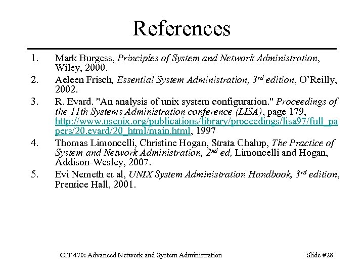 References 1. 2. 3. 4. 5. Mark Burgess, Principles of System and Network Administration, Wiley, 2000. Aeleen Frisch, Essential System Administration, 3 rd edition, O’Reilly, 2002. R. Evard. "An analysis of unix system configuration. " Proceedings of the 11 th Systems Administration conference (LISA), page 179, http: //www. usenix. org/publications/library/proceedings/lisa 97/full_pa pers/20. evard/20_html/main. html, 1997 Thomas Limoncelli, Christine Hogan, Strata Chalup, The Practice of System and Network Administration, 2 nd ed, Limoncelli and Hogan, Addison-Wesley, 2007. Evi Nemeth et al, UNIX System Administration Handbook, 3 rd edition, Prentice Hall, 2001. CIT 470: Advanced Network and System Administration Slide #28