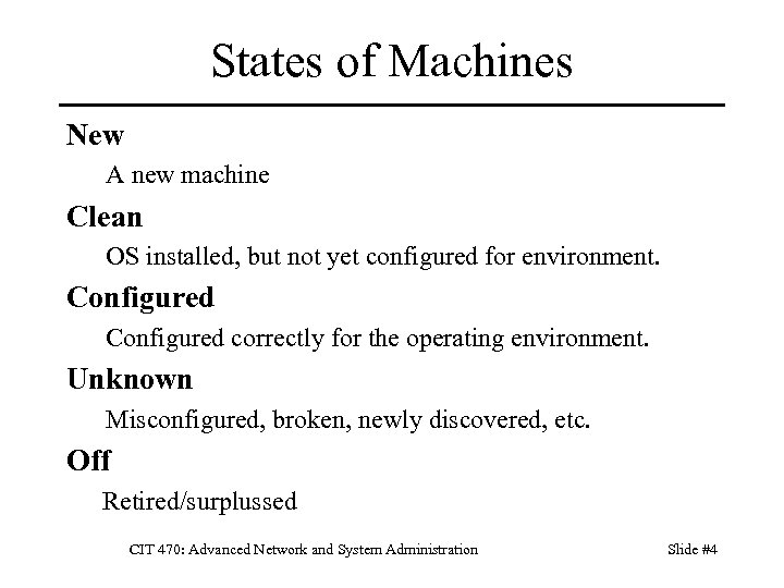 States of Machines New A new machine Clean OS installed, but not yet configured for environment. Configured correctly for the operating environment. Unknown Misconfigured, broken, newly discovered, etc. Off Retired/surplussed CIT 470: Advanced Network and System Administration Slide #4