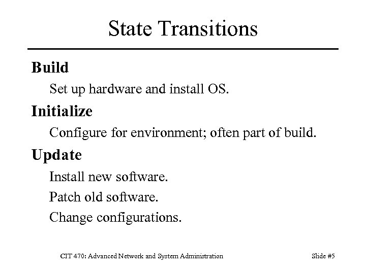 State Transitions Build Set up hardware and install OS. Initialize Configure for environment; often part of build. Update Install new software. Patch old software. Change configurations. CIT 470: Advanced Network and System Administration Slide #5