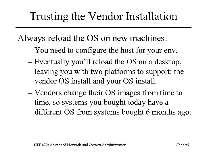 Trusting the Vendor Installation Always reload the OS on new machines. – You need to configure the host for your env. – Eventually you’ll reload the OS on a desktop, leaving you with two platforms to support: the vendor OS install and your OS install. – Vendors change their OS images from time to time, so systems you bought today have a different OS from systems bought 6 months ago. CIT 470: Advanced Network and System Administration Slide #7