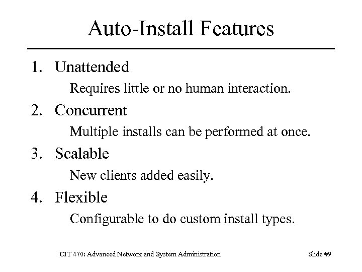 Auto-Install Features 1. Unattended Requires little or no human interaction. 2. Concurrent Multiple installs can be performed at once. 3. Scalable New clients added easily. 4. Flexible Configurable to do custom install types. CIT 470: Advanced Network and System Administration Slide #9