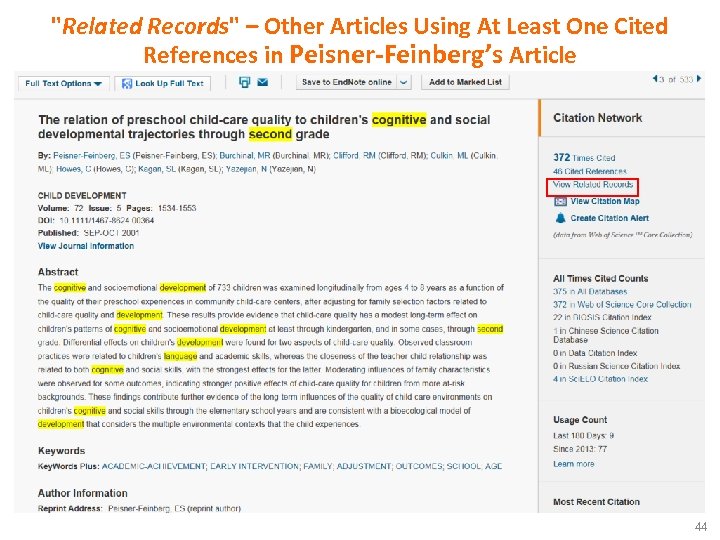 Use Related Records to Identify Similar Articles 5, 398 articles have at least one common citation with this Peisner. Feinberg’s 2001 article The more references the articles share, the more related they are 45