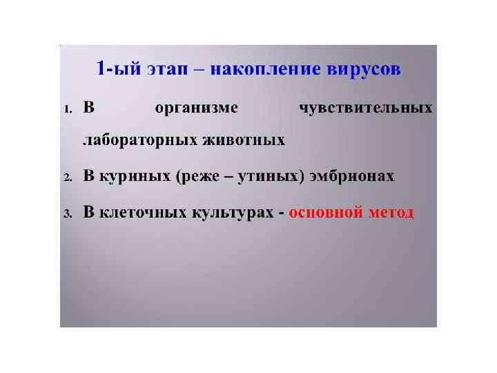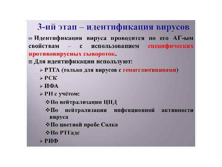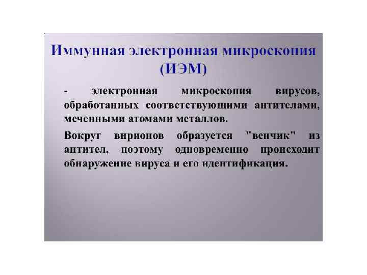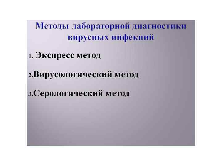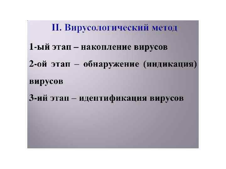 I. ЭКСПРЕСС МЕТОД 2)Обнаружение вирусного АГ или НК в исследуемом (клиническом материале) с помощью: • РИФ • ИФА • РИА 3)НК вируса - ПЦР 4)Вируса – методов электронной микроскопии и иммунной электронной микроскопии