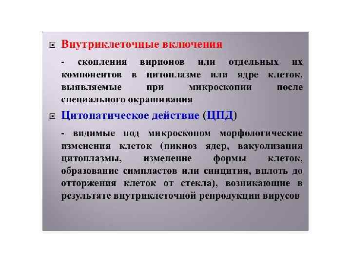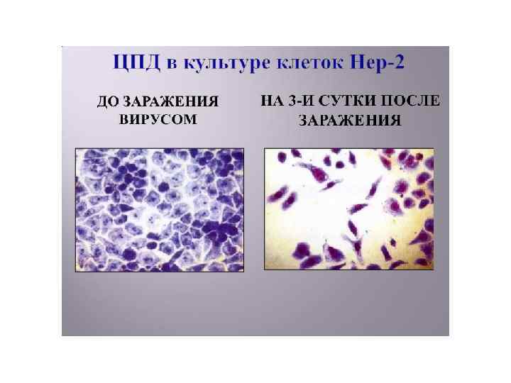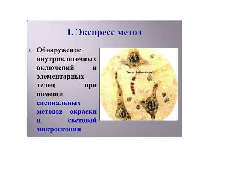 Цитологические методы Исследуются материалы аутопсии, биопсии, мазки, которые после соответствующей обработки окрашиваются и анализируются под микроскопом. • цитомегаловирусная инфекция - в срезах ткани или в моче обнаруживаются характерные гигантские клетки- «совиные глаза» • бешенство - включения в цитоплазме клеток (тельца Бабеша-Негри). «совиные глаза»