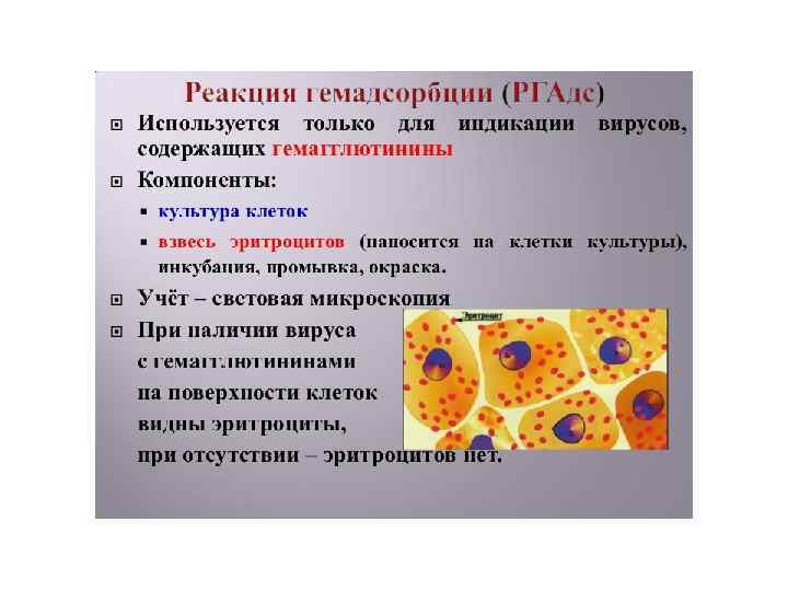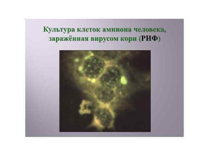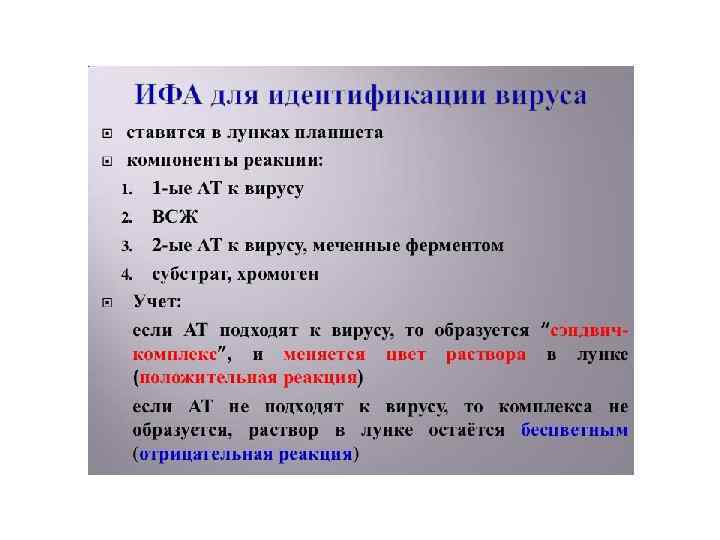 РИФ - Реакция иммунофлюоресценции Метод основан на использовании антител, связанных с красителем. • применяется для быстрой расшифровки этиологии острых респираторных вирусных инфекций. • требует содержания в клиническом материале достаточно большого числа инфицированных клеток. ИФА - Иммуноферментный анализ Метод основан на мечении антител ферментами • позволяет измерять растворимые антигены. • могут использоваться различные виды клинического материала.