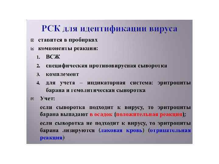 РСК для идентификации вируса Комплемент – сложная система сывороточных протеинов. Нестоек, разрушается при 55 градусах в течение 30 минут. При комнатной температуре комплемент разрушается в течение 2 -х часов. Очень чувствителен к продолжительному встряхиванию, к действию кислот и ультрафиолетовых лучей. Но длительно (до шести месяцев) сохраняется в высушенном состоянии при низкой температуре. Комплемент адсорбируется только на комплексе «антитело – антиген» .
