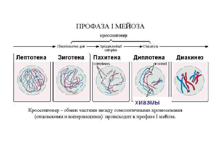 Мейоз состоит из 2 последовательных делений с короткой интерфазой между ними Профаза I — профаза первого деления очень сложная и состоит из 5 стадий: Лептотена или лептонема — упаковка хромосом, конденсация ДНК с образованием хромосом в виде тонких нитей (хромосомы укорачиваются). Зиготена или зигонема — происходит конъюгация — соединение гомологичных хромосом с образованием структур, состоящих из двух соединённых хромосом, называемых тетрадами или бивалентами и их дальнейшая компактизация. Пахитена или пахинема — (самая длительная стадия) — в некоторых местах гомологичные хромосомы плотно соединяются, образуя хиазмы. В них происходит кроссинговер — обмен участками между гомологичными хромосомами. Диплотена или диплонема — происходит частичная деконденсация хромосом, при этом часть генома может работать, происходят процессы транскрипции (образование РНК), трансляции (синтез белка); гомологичные хромосомы остаются соединёнными между собой. У некоторых животных в ооцитах хромосомы на этой стадии профазы мейоза приобретают характерную форму хромосом типа ламповых щёток. Диакинез — ДНК снова максимально конденсируется, синтетические процессы прекращаются, растворяется ядерная оболочка; центриоли расходятся к полюсам; гомологичные хромосомы остаются соединёнными между собой.