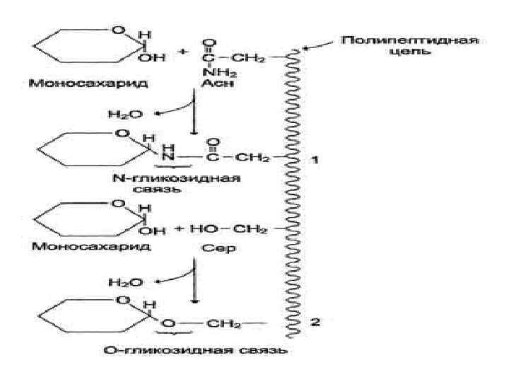 1 2 Белки клеточной стенки грибов: Большинство стеночных белков по свой природе гликопротеины, хотя есть и негликозилированные белки, такие как гликолитические ферменты, шаперон Hsp 40, гидрофобины и др. У грибов обнаружено 3 типа гликозилирования белков: 1 – О-Гликозилирование предполагает наличие О -гликозидной связи между остатком сахара и гидроксильной группой серина или треонина белка. 2 – N-Гликозилирование предполагает связывание разветвленных полисахаридных цепей с белком через хитобиозный мостик при помощи N-гликозидной связи между Nацетил-D-глюкозамином и β-амидным азотом аспарагина в белке. 3 – Белки, содержащие на С-конце гликозилфосфоинозитольный якорь (GPI якорь), который присоединяется к белку через фосфоэтаноламин.