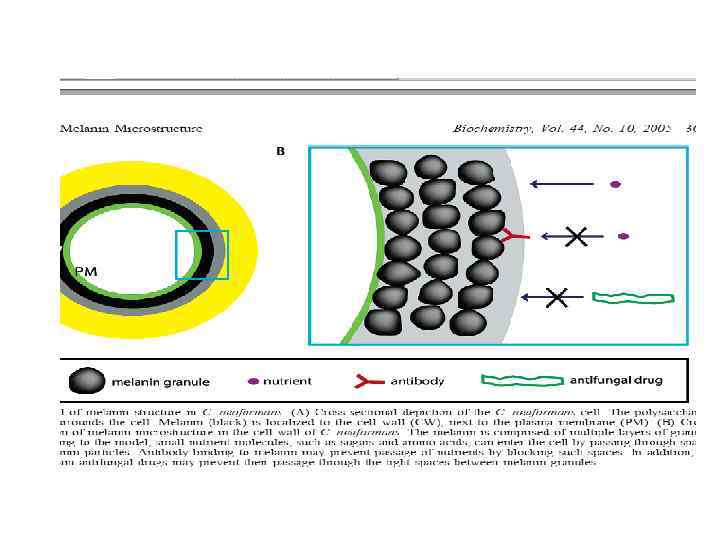 Меланин (защита от противогрибных препаратов) TEM of C. neofomans a b TEM of (a) melanin-lacking (500 w) and (b) melaninproducing (500 b) C. neofomans cells grown in L-DOPA medium for 7 days. Similar results were obtained with the other two pars of isolates. Scale bar, 500 nm, (Magnification X 15000).
